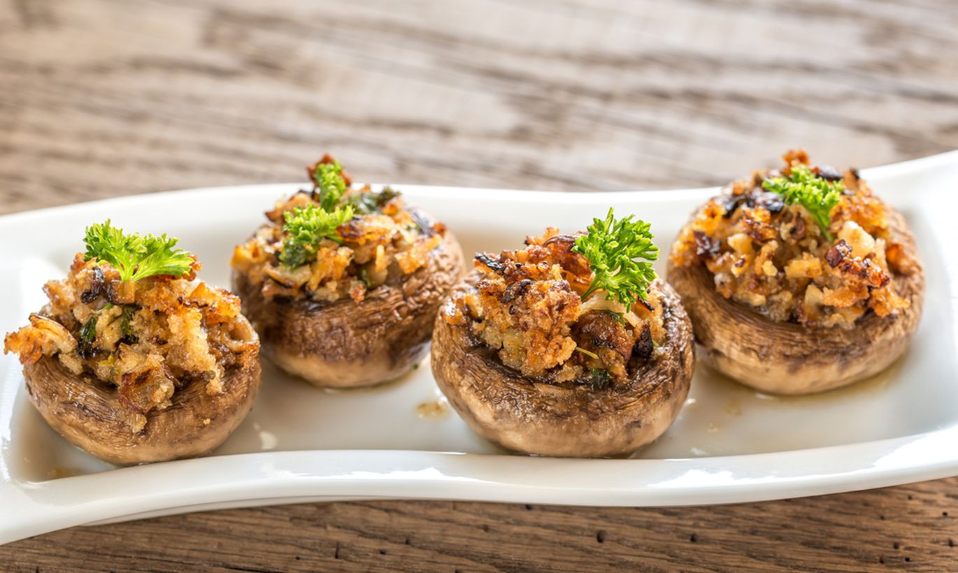 Eemalda šampinjonidelt jalad. Haki peekon väikesteks tükkideks ning aseta see seenekübarasse. Prae hakkliha õrnalt läbi ning suru samuti ettevaatlikult seene sisse. Puista peale juustu ning aseta 200-kraadisesse ahju küpsema. Küpseta 10 minutit ning 2 minutit enne välja võtmist aseta peale saiakuubikud. Serveeri soojalt koos meelepärase lisandiga.